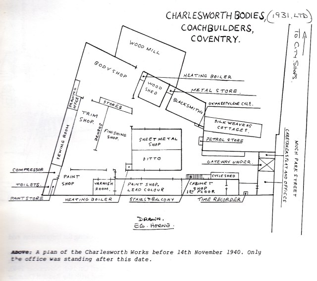 Despite the above the very first car on our chassis run was 23500 with a Charlesworth body from Charlesworth Bodies (1931) Ltd., Coachbuilders of Much Park Street, Coventry. Sadly on the 14th November 1940 it was oil bombed along with the Radcliffe Daimler Works and Coventry Cathedral. It goes without saying that was also the night The Alvis was also hit. The drawings below give a flavour of the Charlesworth site as it was before obliteration.