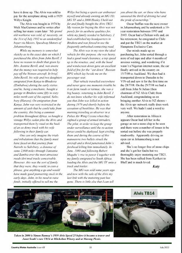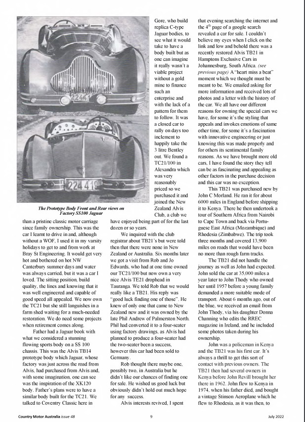 There has been some questioning as to where the prototype went after the completion of the Motor Show Circuit. Now we have research showing that the body was purchased by Jaguar in Birmingham to be looked at as the basis for SS 100. An interesting Article appeared in the on line Australian car magazine Country Motor Australia.. This may solve the question coming from the direction of Jaguar and not Alvis. In addition the whole edition of MCA shows this ‘magazine’ to be an excellent general classic car motoring interest.