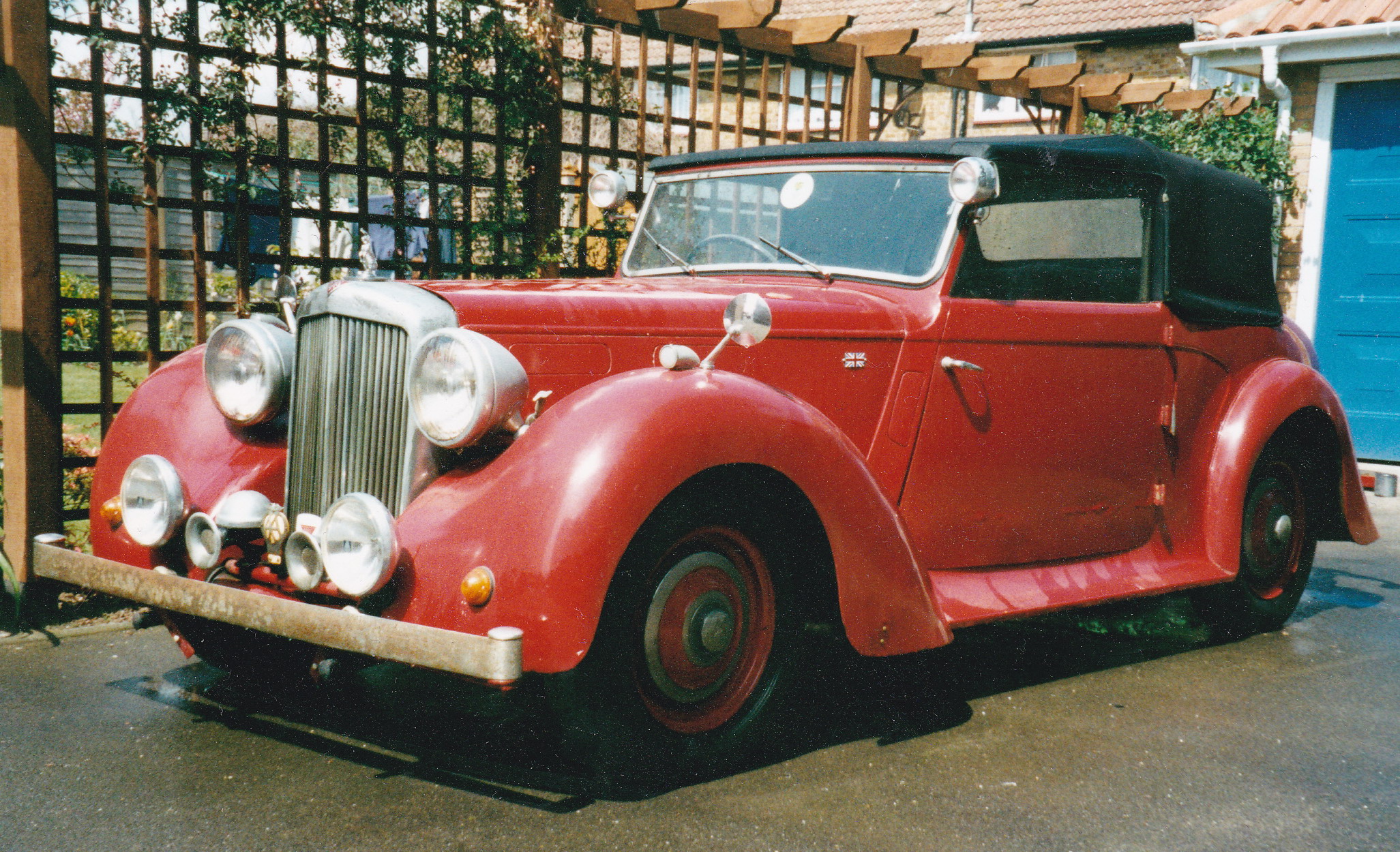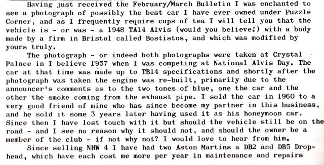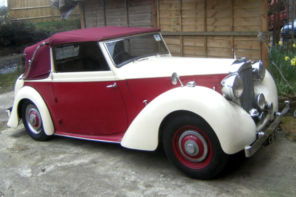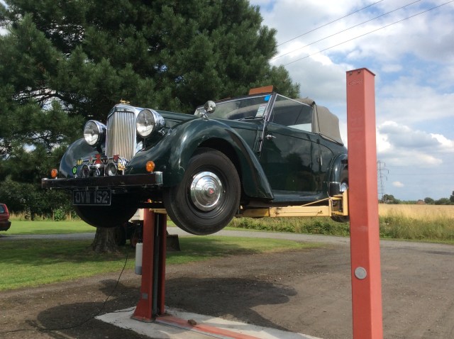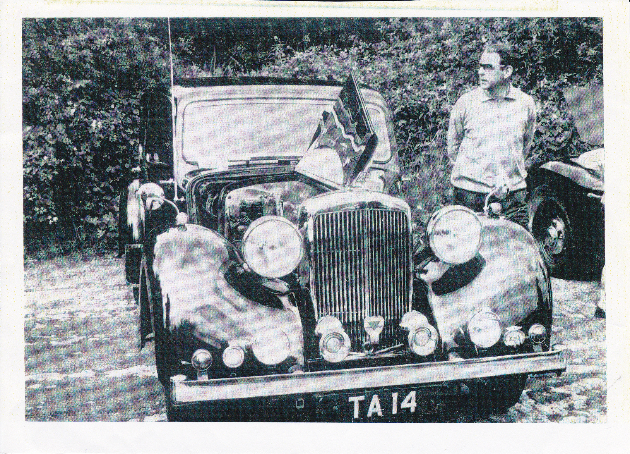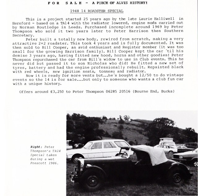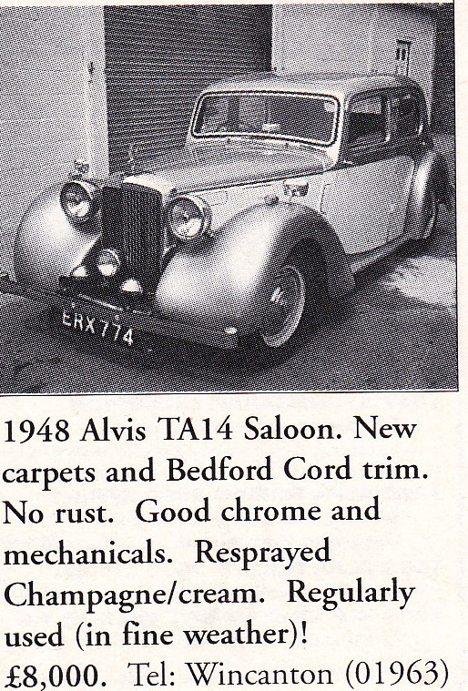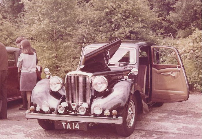 I bought my 1948 Alvis TA14 in March 1973 from Rochester in Kent, and drove her home almost 300 miles to our home in Lancashire; she never missed a beat but I almost did. I had travelled South by train, carrying a few vital tools in a rucksack and after the necessary transaction, headed back North at around 3.00pm. It was a fine spring day in Kent, sunny and warm. The vendor had owned the car for some seven years and boasted he had never raised the hood in all that time, and he was right. This was the “Garden of England” however and this Northerner was not over optimistic, so I attempted to raise the hood. Its seven years of dormancy however thwarted all attempts; it would not budge, so I set off alfresco. All was pleasant and well until I joined the M1 near Luton, my which time dusk was approaching, the temperature was plummeting and we were maintaining a steady 60+ mph. I was wearing my old denim jacket and turning up the collar made no difference at all. I took what would be the first of many a coffee and warm-up stop at Watford Gap and had another go at that wretched hood, but to no avail. I cracked on, frozen to the marrow; the only thing keeping me alive was the adrenalin. I reached the M6 and stopped again at Hilton Park, where I stood for 10 minutes in the warm blast of the kitchen extractor exhaust vents. Oh bliss!